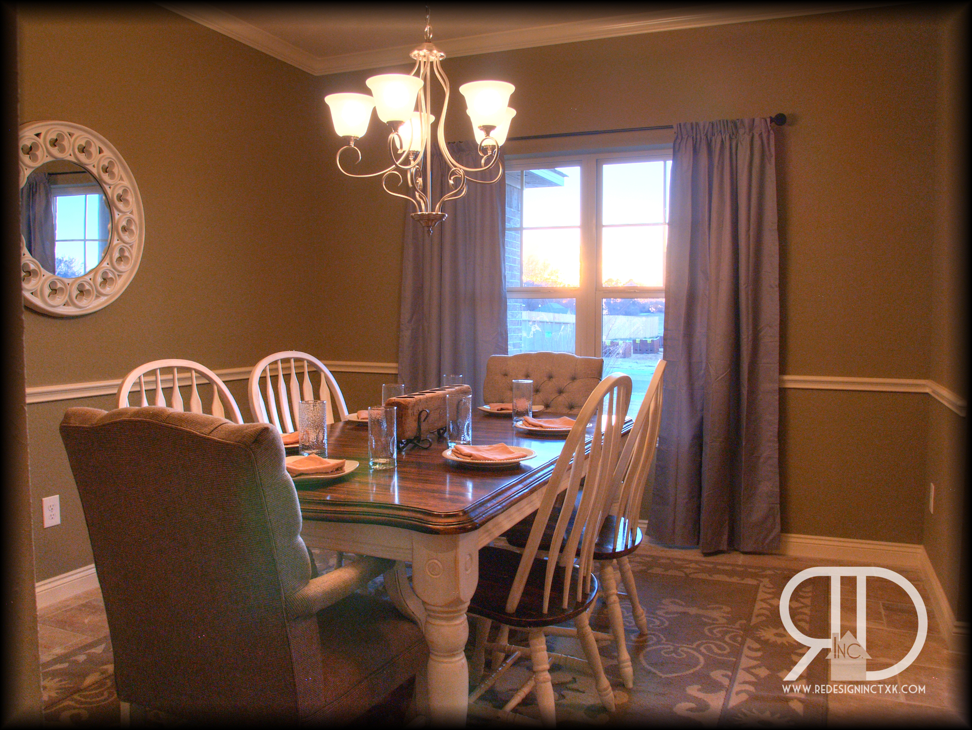 Now this space is easily defined, no guessing here! For this size room I like to use a six chair dining table to show the buyer there is of plenty room for it, and more if needed. Ok, side note…this is table that we reDesign’ed (gotta love gel stain and chalk paint), you can read all about it HERE!