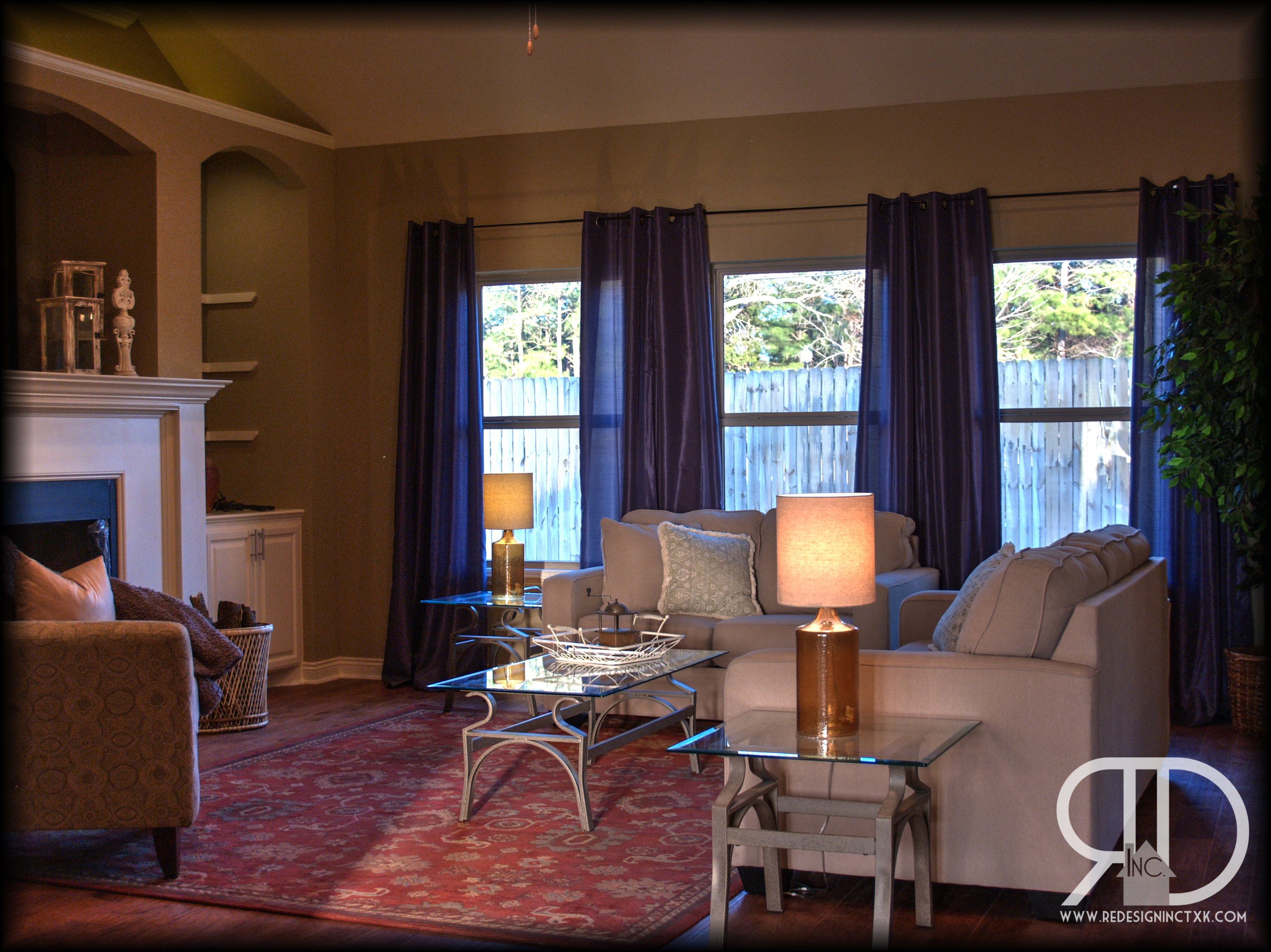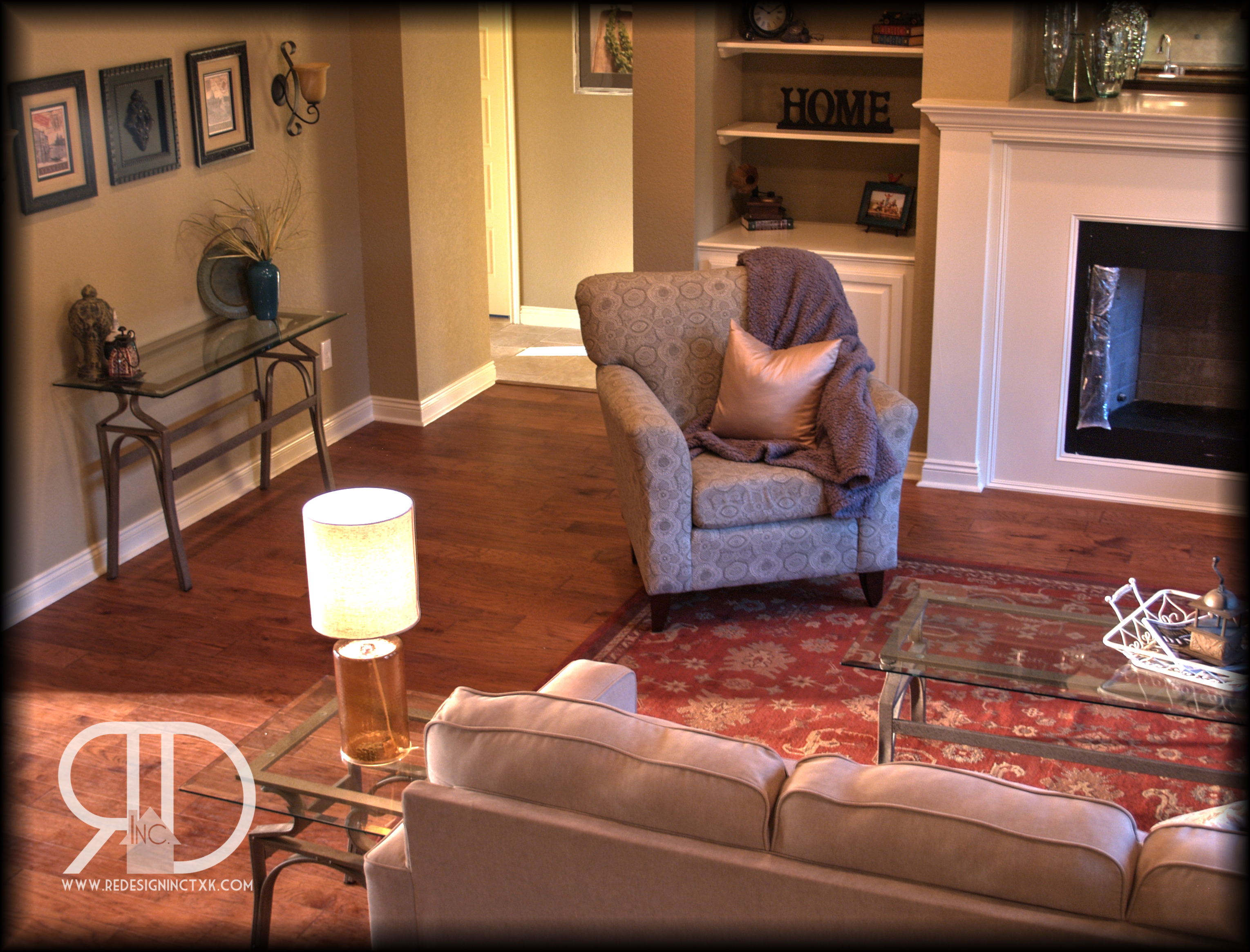 Man don’t you wanna curl up on that chair with the fuzzy blanket and light a fire in the Texas-sized fireplace? You can see the warmth of the floors, the beautiful windows, and those awesome built-ins now that they are highlighted by the furnishings brought into the room. They are no longer in the background, the details are brought to the forefront, exactly what we want potential buyers to see.