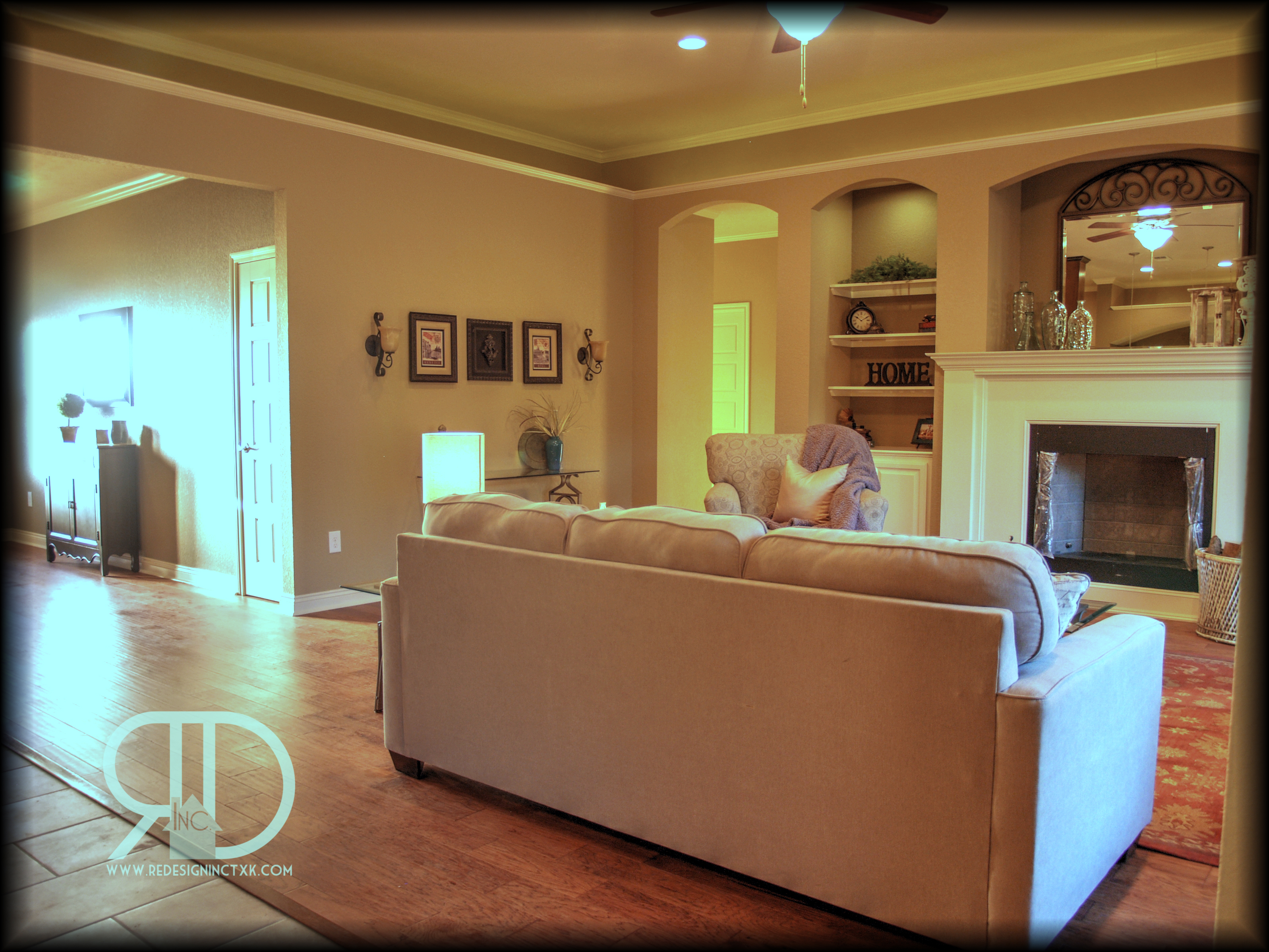 The gorgeous living room with the warm wood floors, amazing windows and fireplace calls your name as you enter the home, but looking at the before picture from the builder’s website you are more likely to notice the dust on the floors than the unique niche that runs around the room. Seriously people this fireplace is HUGE!!! They do say everything is bigger in Texas, and being on Lone Star Parkway this home definitely lives up to that!